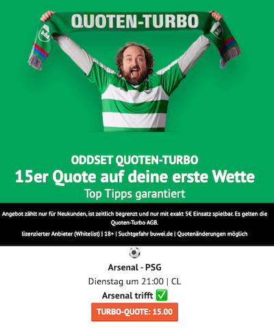 Für alle Neukunden bietet ODDSET einen attraktiven Quotenboost an: Eine Quote von 15,00 darauf, dass Arsenal FC mindestens ein Tor erzielt. Diese Aktion ist zweifellos verlockend, besonders angesichts der Offensivkraft von Arsenal und der Tatsache, dass sie in den letzten direkten Duellen oft erfolgreich waren. Der maximale Einsatz für diesen Boost beträgt lediglich 5€, und die Auszahlung erfolgt in Form von Bonusgeld. Es ist eine interessante Möglichkeit für neue Kunden, sich zusätzliches Kapital für weitere Wetten zu sichern. Der Champions League Boost ist bis zum Beginn des Spiels verfügbar, was den Wettenden genügend Zeit gibt, sich die Konditionen anzuschauen und möglicherweise zuzuschlagen.