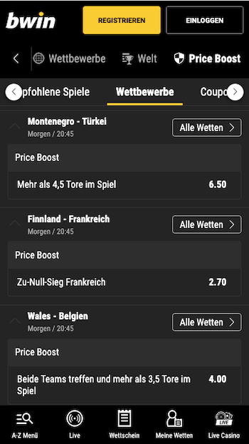 Für das Spiel Montenegro – Türkei gibt es außerdem einen Bwin Price Boost am 16.11.21 zu kassieren. Damit kannst du dir eine erhöhte Wettquote von 6,50 holen, wenn du an mehr als 4,5 Tore im Spiel glaubst. Alle weiteren Infos zum Angebot von Bwin findest du weiter unten.